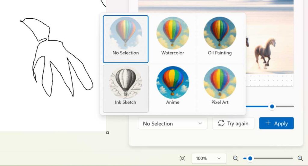 You can also click the “No Selection” drop-down to choose a style. Here, those choices are Watercolor, Oil Painting, Ink Sketch, Anime, and Pixel Art.