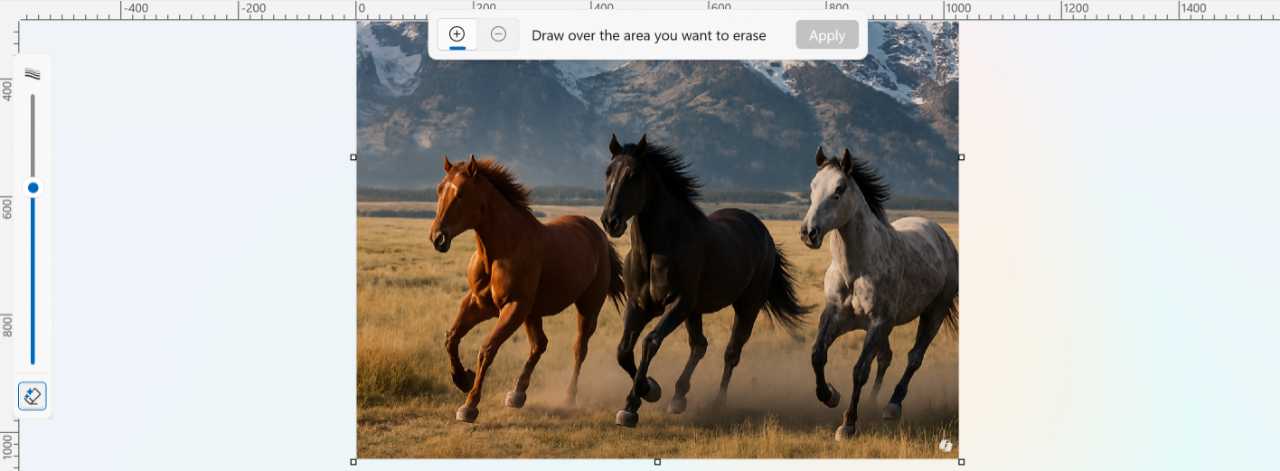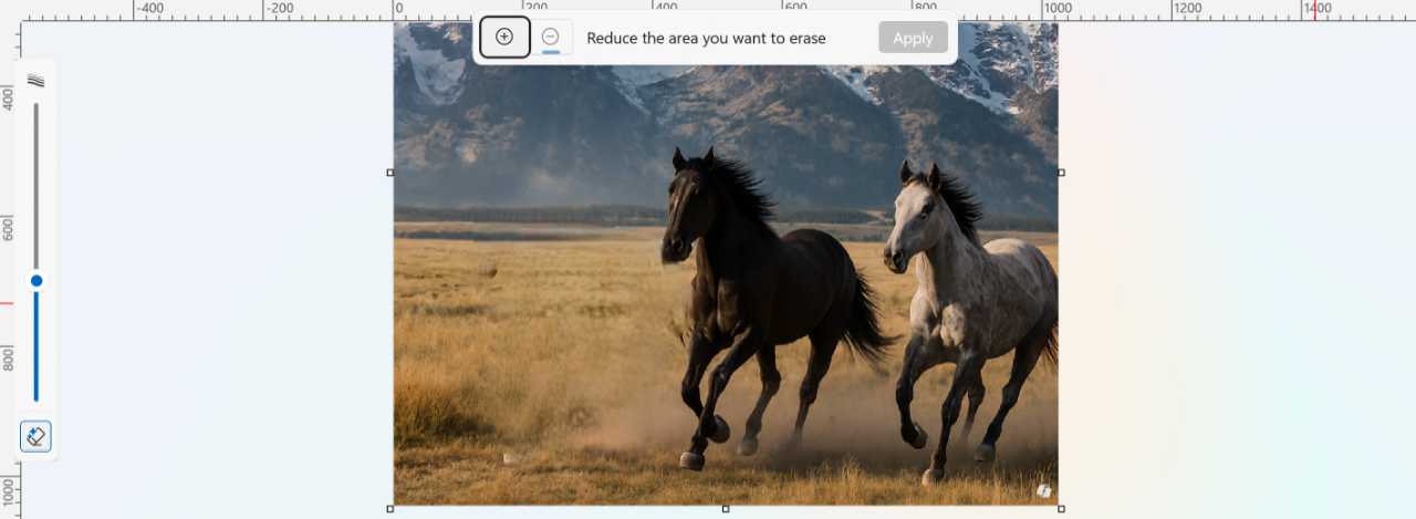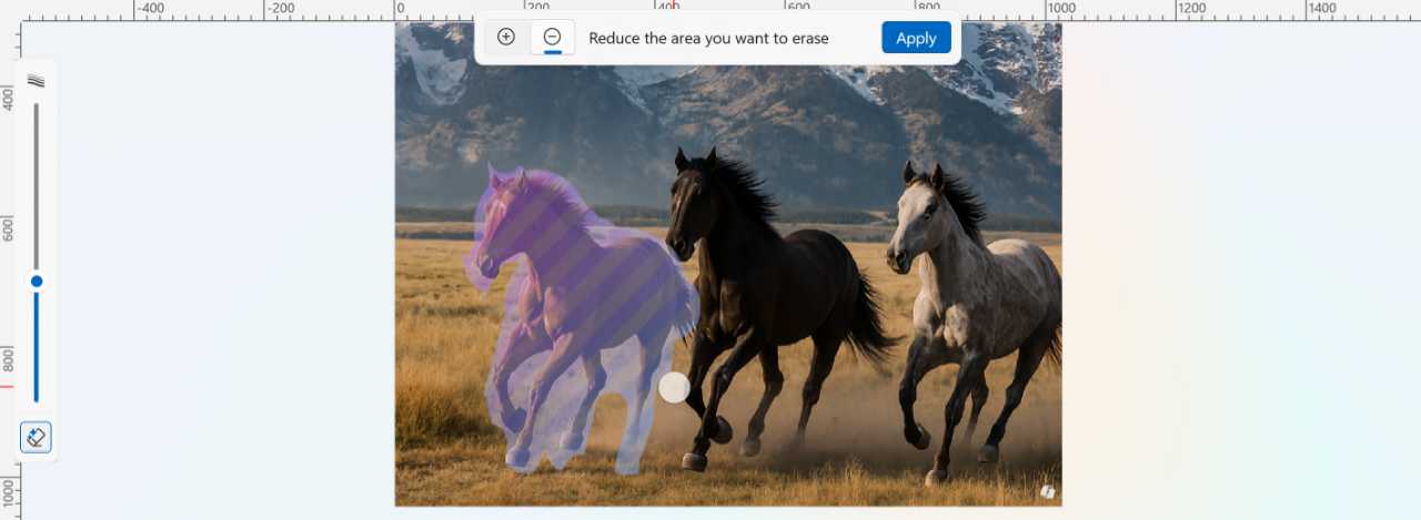 To get started, open an image in Paint and select Generative erase from the Copilot menu. When you do, two new interfaces appear: A Generative erase pop-up in the top center of the app with “Add area to erase,” “Reduce area to erase,” and “Apply” buttons, and a Generative erase slider on the left that lets you resize the round eraser cursor you will use to select one or more areas to erase.