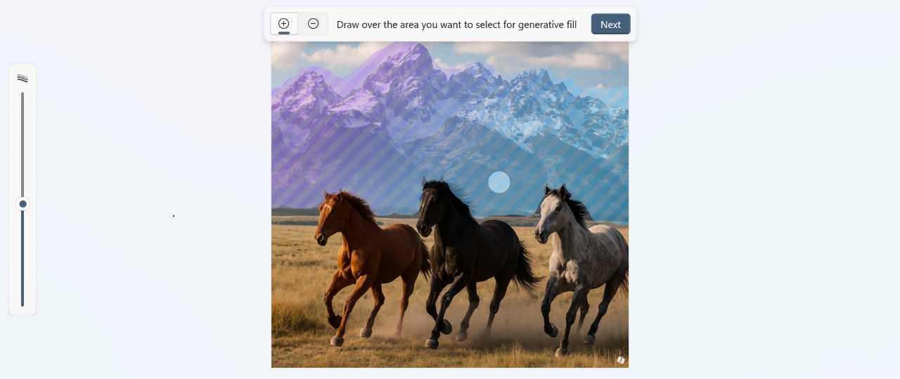 To get started, open an image and select Generative fill from the Copilot menu. Two new interfaces appear: A Generative fill pop-up centered over the image with “Add area to fill,” “Reduce area to fill,” and “Next” buttons, and a Size slider on the far left so you can size the selection cursor you’ll use to define the area to change.