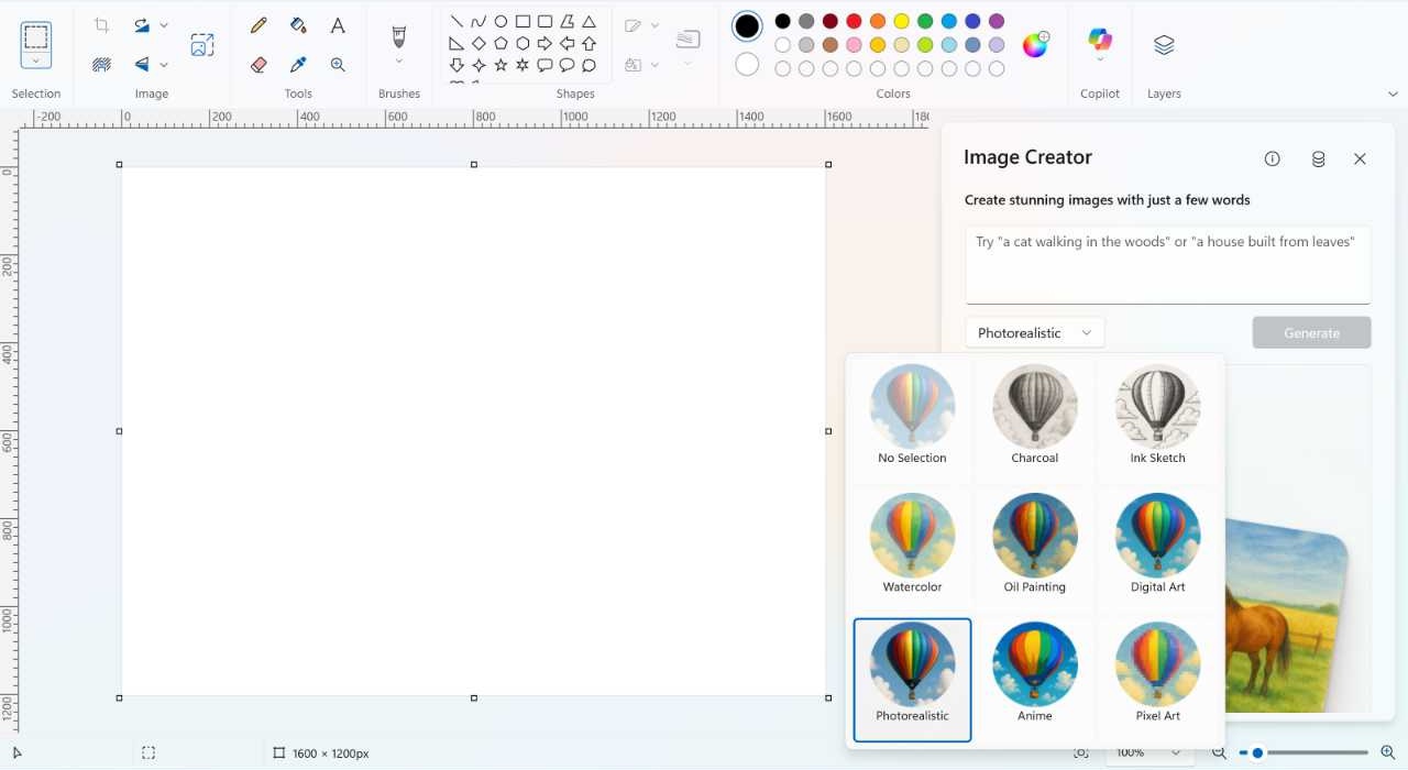 Image Creator is Paint’s version of the image creation capabilities found in OpenAI ChatGPT, Google Gemini, and other AI chatbots: You type a prompt—i.e., describe the image you’d like Paint to create—optionally choose an image style from the “No Selection” drop-down menu, and then the app, powered by OpenAI’s DALL-E image generation AI model, gets to work.