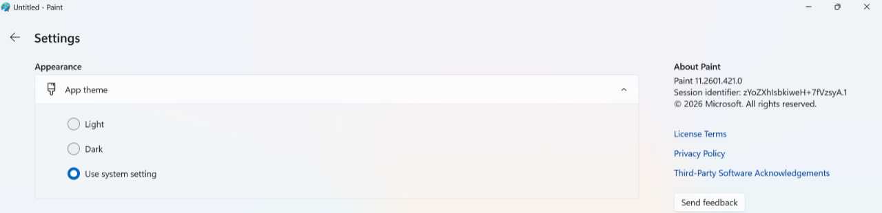 The app theme. By default, Paint will use the app theme—Light or Dark mode—you configured in the Settings app (in Personalization > Colors > Choose your mode). But you can override this choice for Paint only in the app’s otherwise sparse settings interface, which you can find by clicking the “Open settings” (gear) icon in the upper-right of the toolbar.