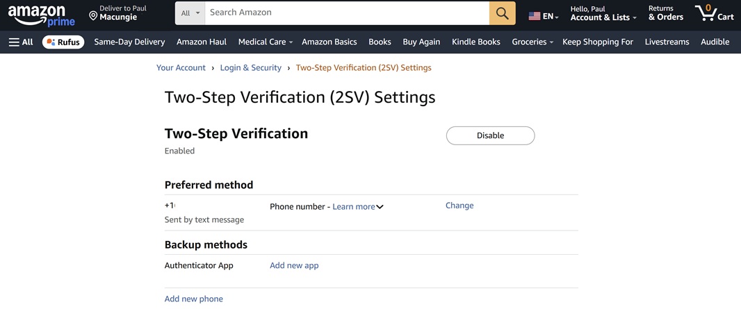 As an example, you can add an authenticator app to your Amazon account by signing in to Amazon.com in your web browser and navigating to Accounts & Lists > Accounts to view the Your Accounts page. Then, click Login & security and sign-in as required and navigate to 2-step verification to view Two-Step Verification (2SV) Settings.