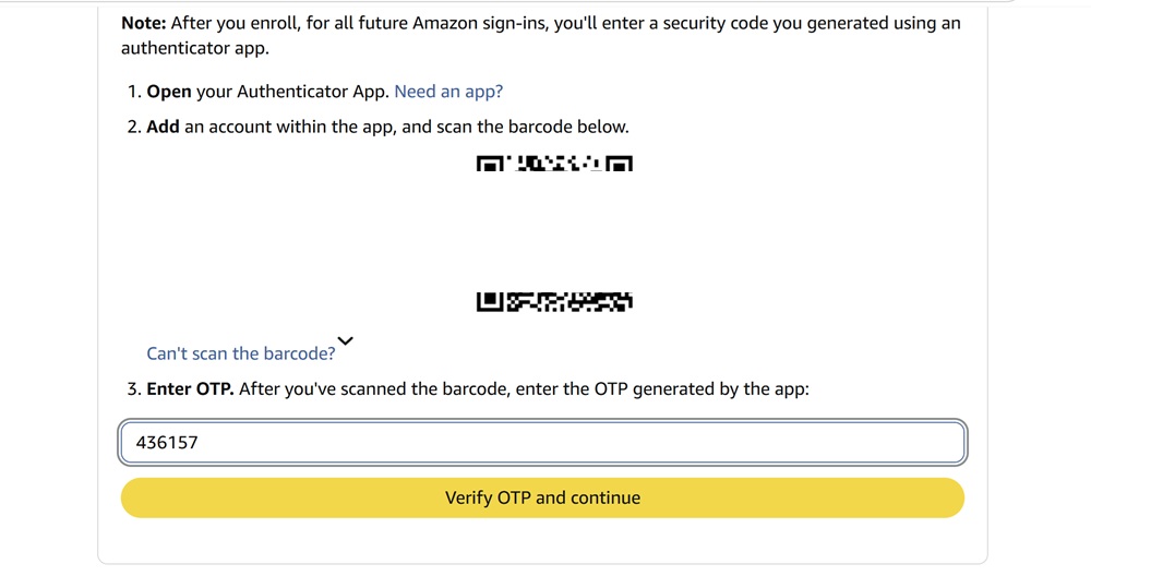 On the Amazon website on your PC, enter the code displayed for that account in the authenticator app. Then, click “Verify OTP and continue” to complete this process.