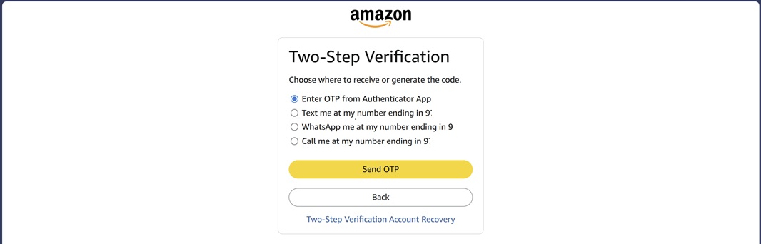 Now, Amazon will prompt you to enter a two-step verification code. If you previously configured a phone number with your account, it will default to that. But you can cancel that and choose a different method. (And this will be the last time you need to do that.)