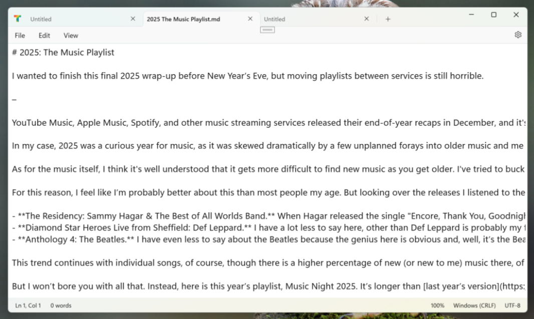 My goal for this app in 2025 was to implement the multiple document/tab functionality. But that didn’t happen, in part because of limitations in WPF—most notably, its tab controls were designed for the tabbed dialogs of the early 2000s, and not for multiple document apps like mine—and in part because I then decided to migrate over to the more modern (but terrible) Windows App SDK and WinUI 3. And that required significant effort, research, and learning. Still does.