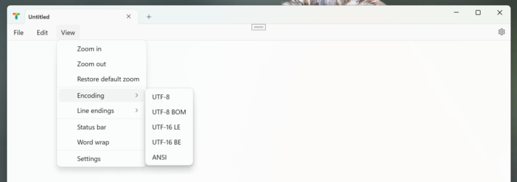 The menu system in my version of WinUIpad closely followed the design of that in Notepad, with top-level File, Edit, and View items. But the Clairvoyance version added a Format top-level menu item, moved some menu items around, and added some new ones, like those for the new line ending and encoding features it added. I’m not sure those options belong in a menu, but for now, I just created something very close to my version of the menu system.