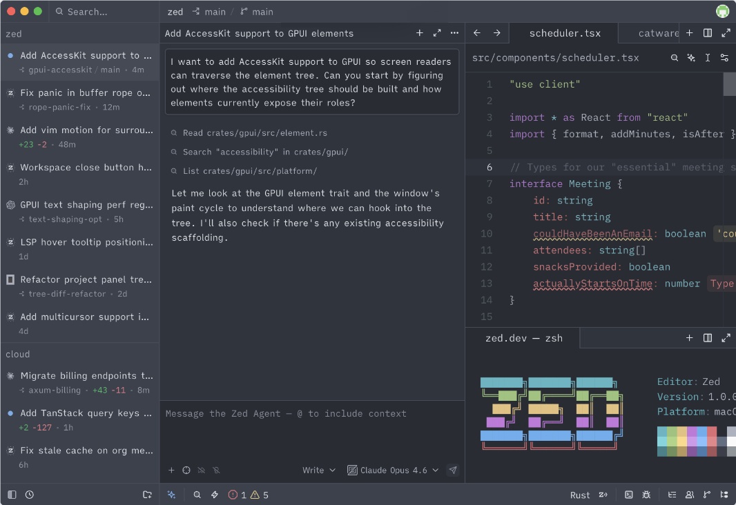 Using Rust and owning every layer of the software stack allowed Zed’s makers to deliver a lightning fast native code editor that runs on all the desktop platforms. It’s modern in every way, and supports dozens of programming languages, Git integration, SSH remoting, a debugger, and agentic AI capabilities, including integration with Claude Agent, Codex, Cursor, and more.