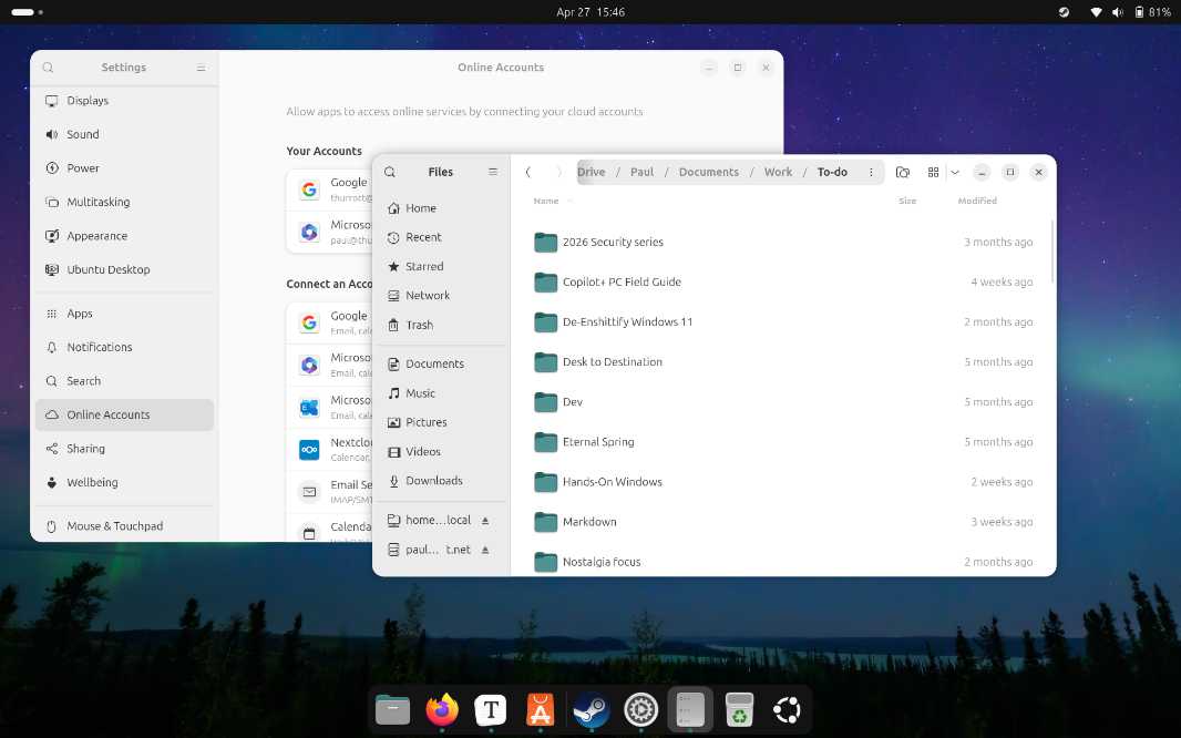 The problem, of course, is that I’ve had trouble getting this to work lately. Indeed, I had experienced the Online Services issue I wrote about in Switcher 2026: Zorin OS 18.1 ⭐ with a pre-release version of Ubuntu 26.04, too. But when I more recently clean-installed the shipping version, that worked normally again. There are some UI differences–Ubuntu has a single Microsoft 365 entry in Online Accounts instead of separate consumer and business entries, for example–but I was delighted to see it just work the first time and without needing to fumble around with different browsers.