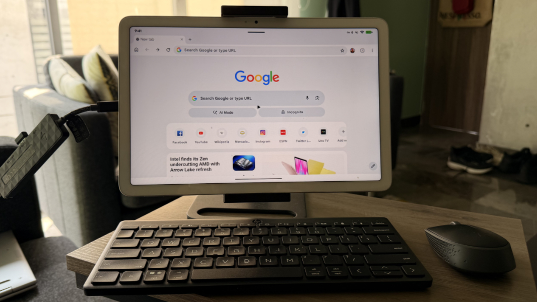 But again, touch is one thing. What I’m most curious about is that laptop scenario. So I grabbed the smallest of my USB hubs, my Bluetooth keyboard and mouse, and a tablet stand to see whether I could emulate a laptop using the Pixel Tablet. Long story short, it works mostly as expected. I had to pair the keyboard to the tablet, while the mouse has a dongle I plugged into the dock. So I put the Pixel Tablet in the stand, connected the USB hub to passthrough power, which is likely not completely necessary, and then plugged the dock into the Pixel Tablet. Voila. A Frankenstein Android laptop of sorts is born.