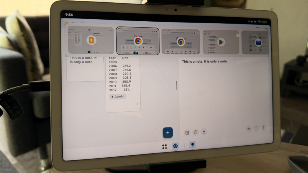 That setup is obviously fine for light testing, but I am curious how Android—or the Android/Chrome OS mashup we call Aluminum OS—will fare on those future laptops. That I can’t test per se, not yet. But this morning I was making an espresso and I glanced over at the Pixel Tablet that we use here as a smart display on its dock. And it occurred that this device, which is enrolled in the Android betas through the Android Developer program, might provide an even better approximation of those future laptops.