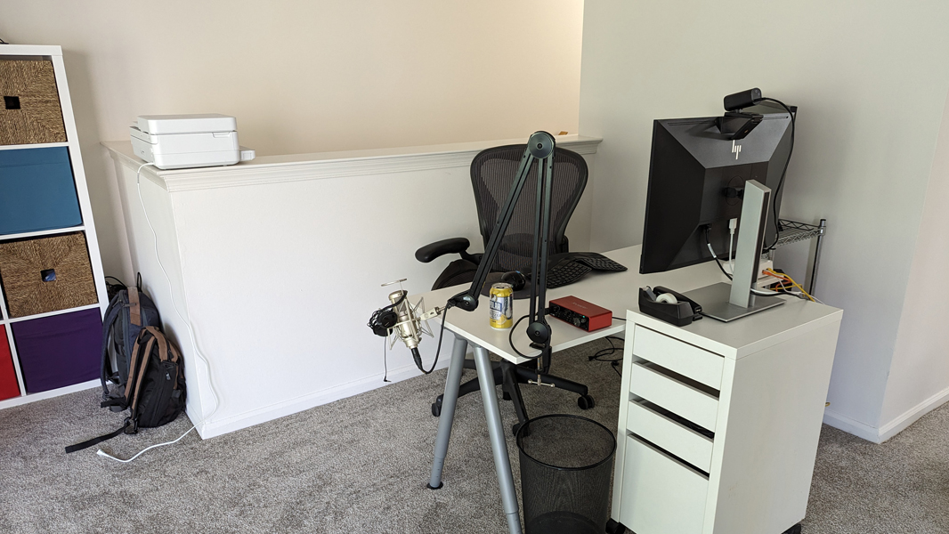 My home office setup is not ideal. I’m still working from the same desk and basic setup that I had in my dedicated home office at the house; there I was using what was usually a dining room as my office, but I moved into the finished part of the basement during the home sale process so we could stage that room as a dining room again. But I don’t have a dedicated room. I could use what would normally be the dining room here, though it’s open to the kitchen and has no wall on one side. But I decided to just set up my desktop in a kind of nook/corner of the living room, which is big. The last time I had a setup like this, I was probably still in my 20s. So it’s weird.