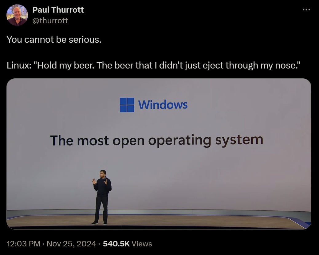 Most seem to take this, as I did, as a complete misunderstanding of what it means to be open as an operating system. Many cracked jokes about security, which is ironic given the context, as in “Maybe open as in, open backdoors and security vulnerabilities.” Or bloatware. Or enshittification. Some, even more humorously, either agreed with this assertion or tried to defend it. Or used this as an opportunity to take a drive-by pot-shot at Linux, for some reason. And dear God, some even tried to mansplain to me. (“Remember, Linux is not an OS, it’s a kernel.”) There many animated GIF responses, so many animated GIF responses. And yeah. It kind of runs the gamut, really.