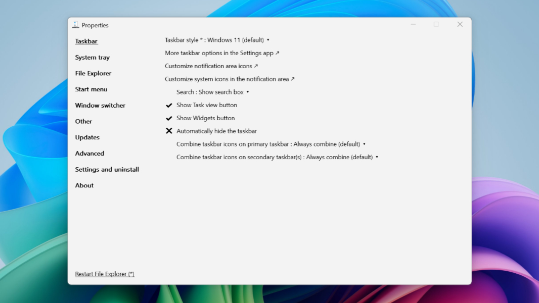 First, on the default “Taskbar” view, I change the very first option, “Taskbar style,” from “Windows 10 (ExplorerPatcher)” to “Windows 11 (default).” Then, I click the “Restart File Explorer (*)” link at the bottom of the ExplorerPatcher window so that change can take effect. Much better.